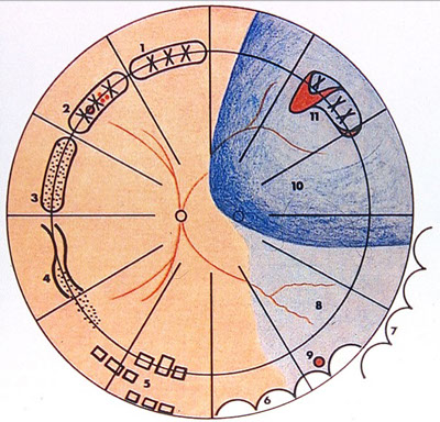 Aus: Meyer-Schwickerath G., Wessing A. Fundusschema und Augenquerschnitt, Klin. Monatsbl. Augenheilk. 1975, 166:372-377